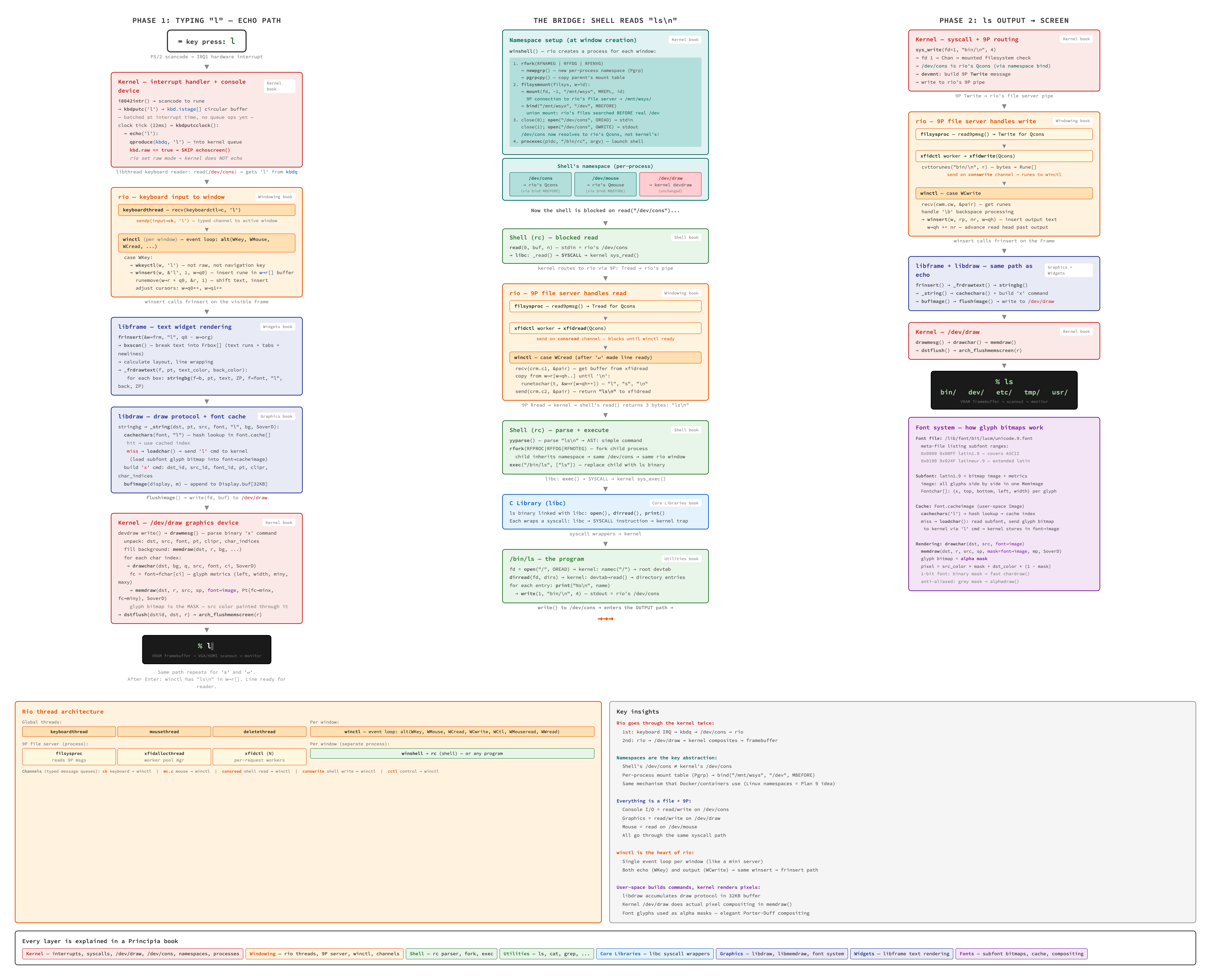 Finally, here is the complete picture with actual source code snippets, data structures, and file paths. This is the level of detail you reach after reading through the Principia books. Every layer is traced to specific functions, every data flow annotated with the relevant code.